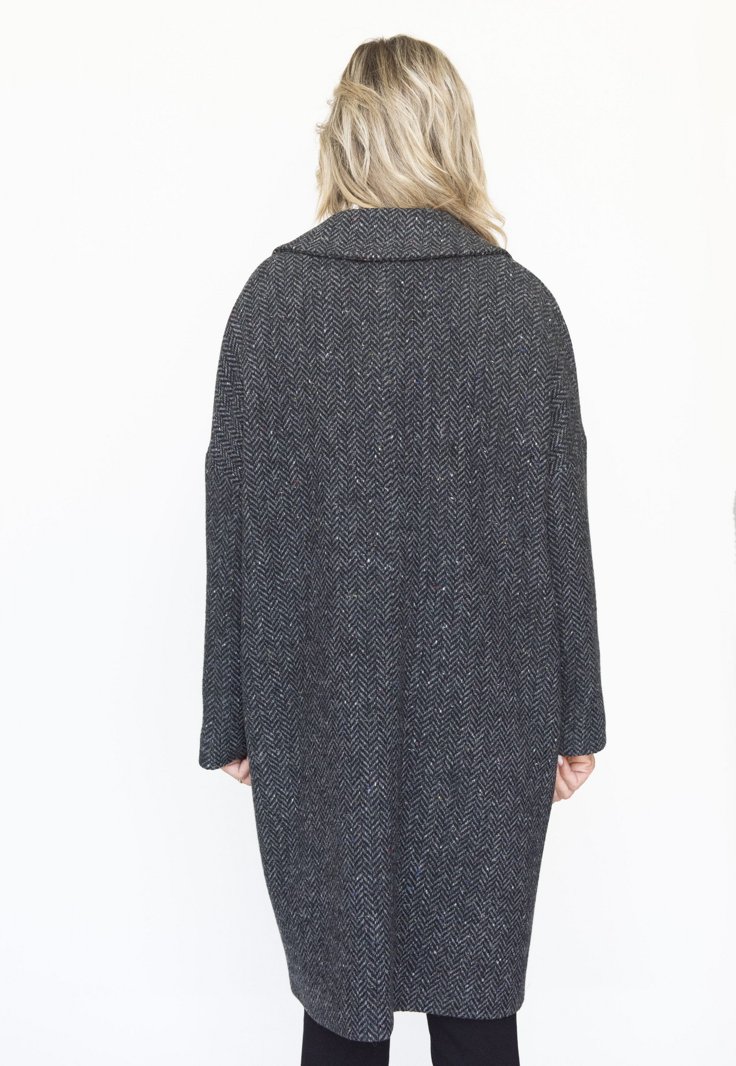 Cappotto donna in tweed pura lana vergine. Vestibilità Over attuale, manica calata mezza raglan.