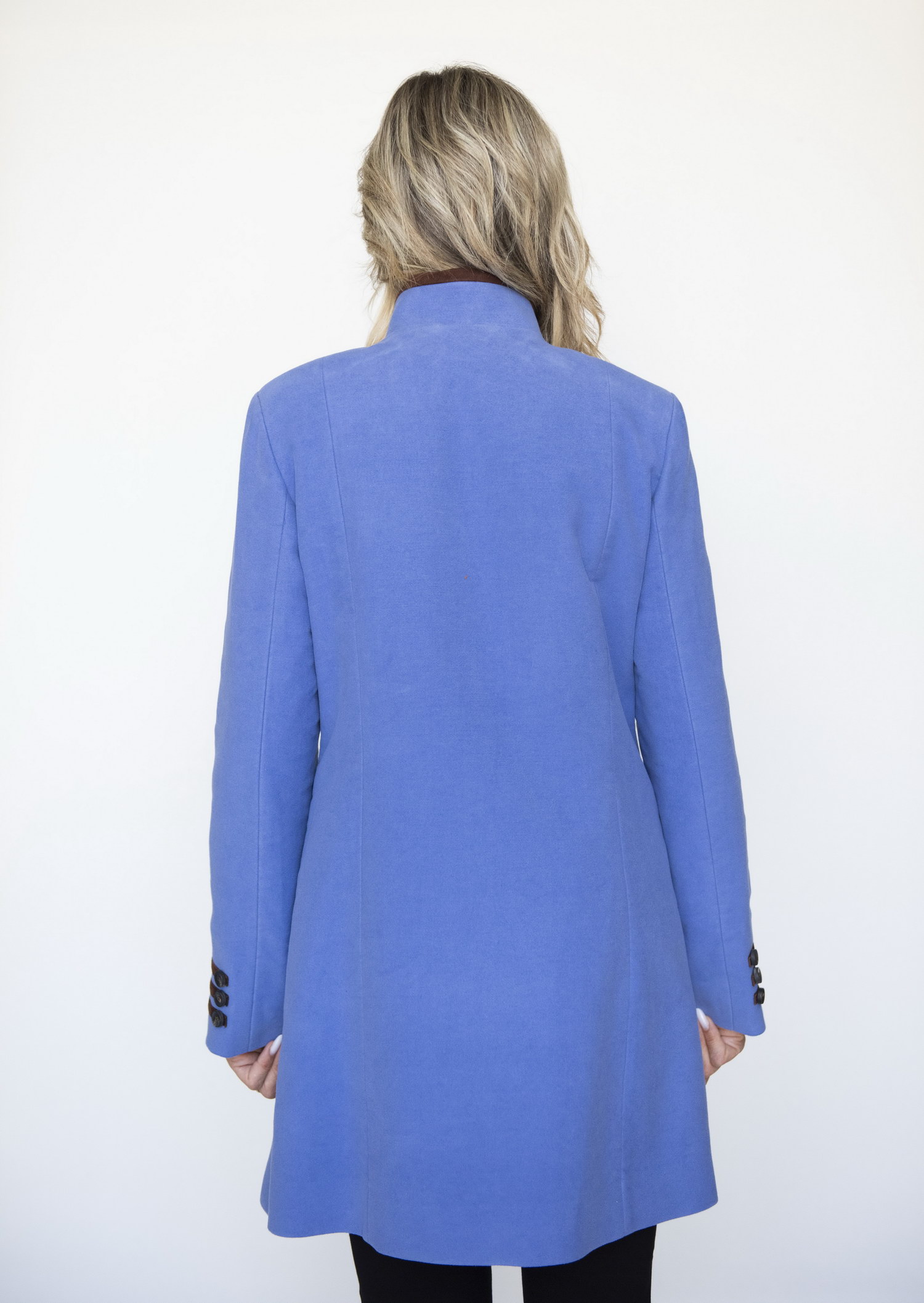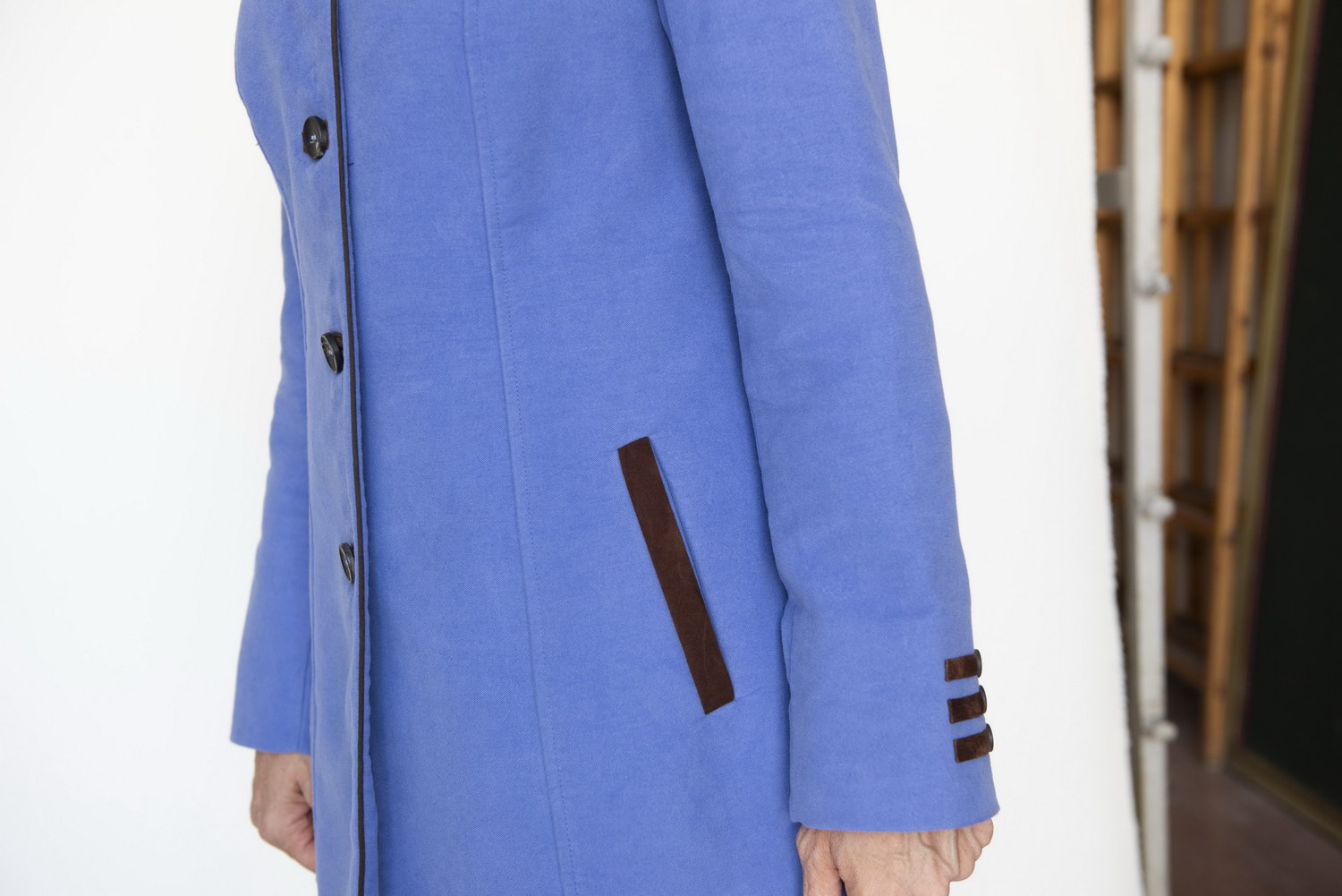 Cappotto 3/4 donna in fustagno con inserti in pelle, collo alla coreana e motivo di pelle sul fondo manica.