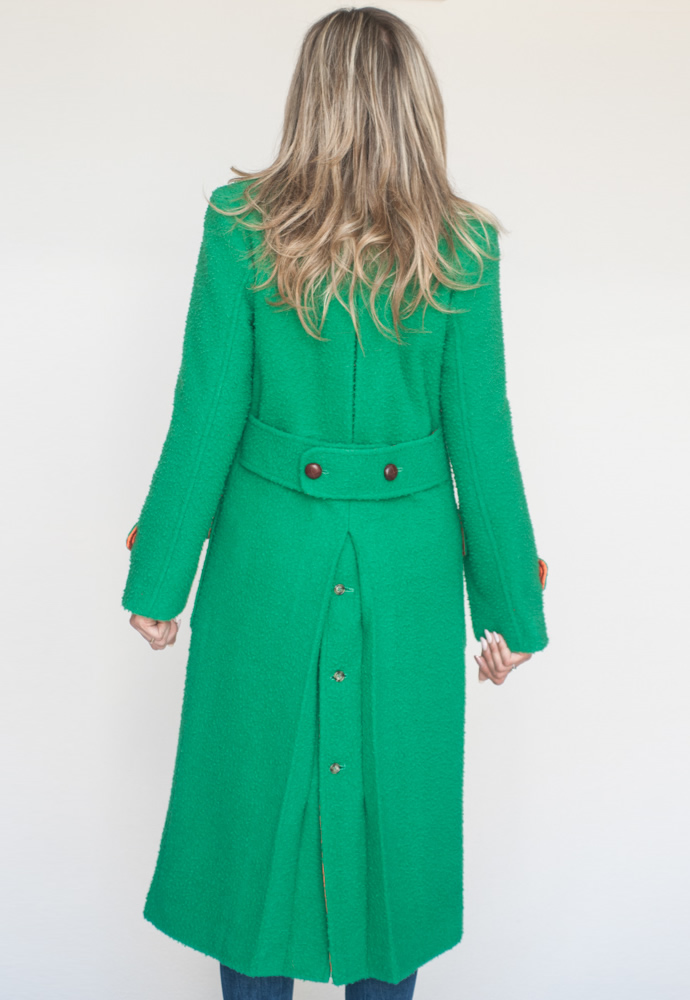 Tradizionale cappotto doppiopetto con tasche a toppa, martingala e piegone apribile. Bottoni a palloncino in pelle e collo classico.